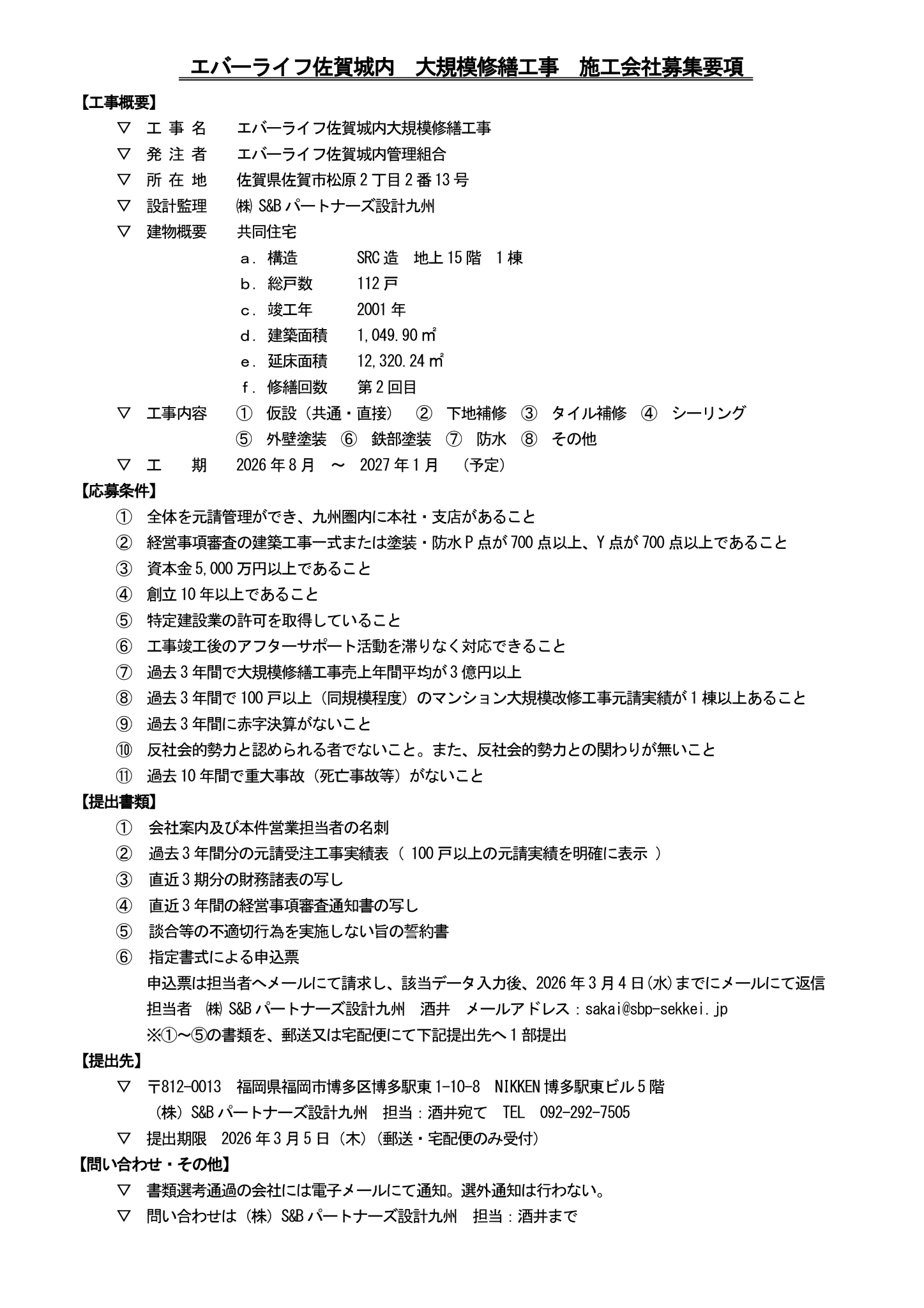 エバーライフ佐賀城内大規模修繕工事 施工会社募集